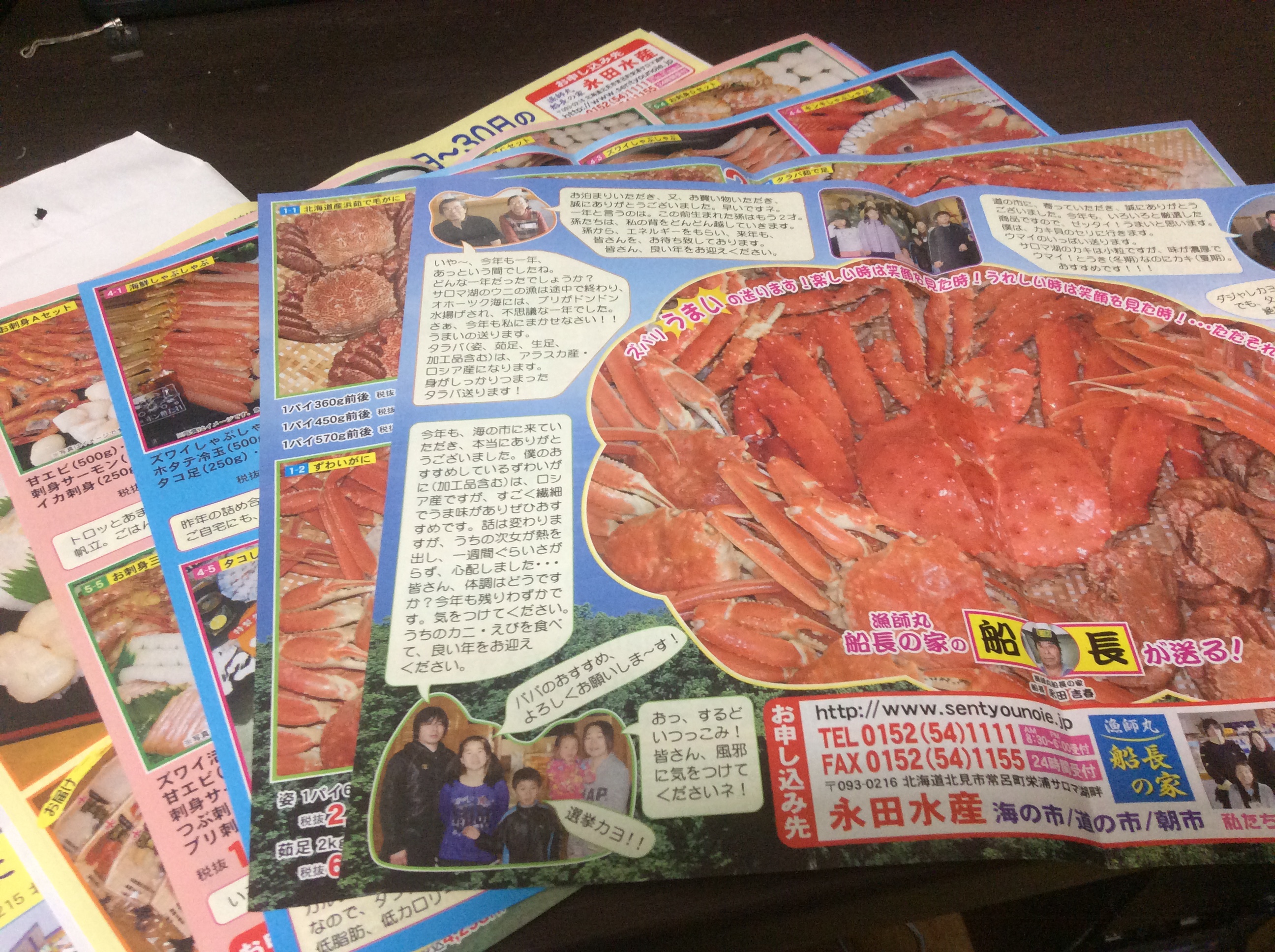 毎年漁師たちのコメントと共に8枚ものカニや魚介類、船長の特選おせちセット等がびっしり掲載されている。